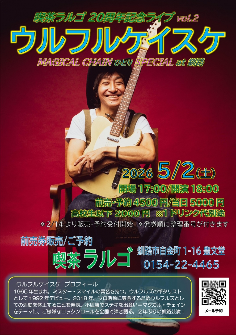 件名:5/2ウルフルケイスケ/本文:予約氏名、人数、電話番号を明記の上で送信してください。