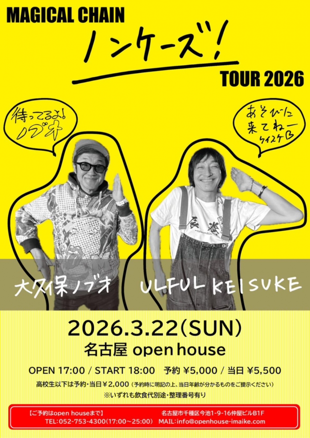 件名に『MAGICAL CHAIN ノンケーズ TOUR 2026予約希望』と入れていただき、本文にお名前(フリガナも) / ご希望人数 /お電話番号 / メールアドレスをご明記の上、お送りください。